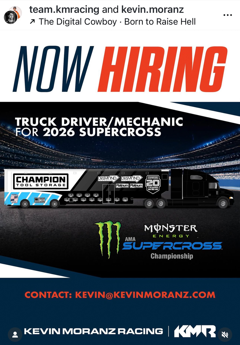 Kevin Moranz est maintenant propriétaire de son équipe. Il cherche un mécanicien et un conducteur de semi-remorque. Pas la peine d’aller sur le site de France Accueil.