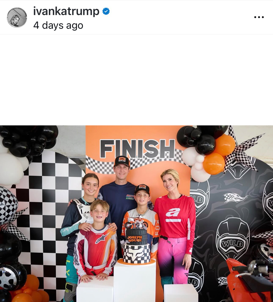 L’un des fils d’Ivanka, la fille du Président américain Donald Trump, fête ses 12 ans avec un thème motocross. La famille est sponsorisée par Fox Racing, Fly Racing, Answer, Alpinestars et Thor. C’est de la politique. Pas de jaloux.