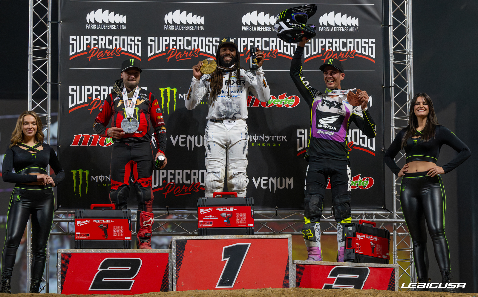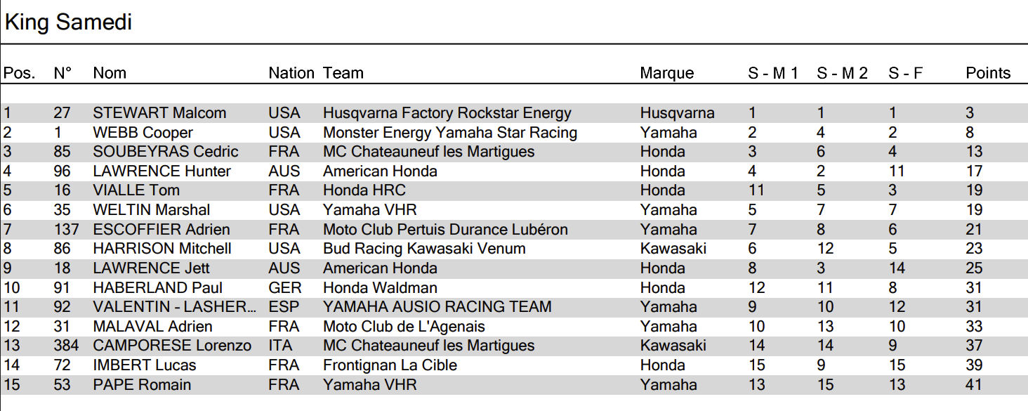 Tout bascule lors de la finale, lorsqu’il part à la faute dans les whoops et ne se relève qu’avec l’aide de l’unité de soins mobiles. Est-il blessé ? A quel point ? En attendant un bilan complet, l’issue de cette 1ère soirée est forcément décevante. Elle n’est pas perdue pour tout le monde. Si on le savait capable de jouer les trouble-fêtes, Malcolm Stewart a fait bien mieux. Vainqueur des trois manches, le pilote Husqvarna s’offre la soirée parfaite, prenant une sérieuse longueur d’avance dans la course au titre de « King ». Couronné l’an dernier, Cooper Webb se contente de la 2ème place au terme de cette 1ère soirée tandis que Cédric Soubeyras se hisse sur le podium, solide et régulier. De surprises en déceptions, on attend maintenant la confirmation des uns, la revanche des autres. Vivement dimanche pour ne rien manquer de la suite.
