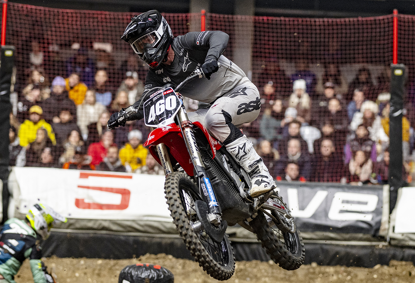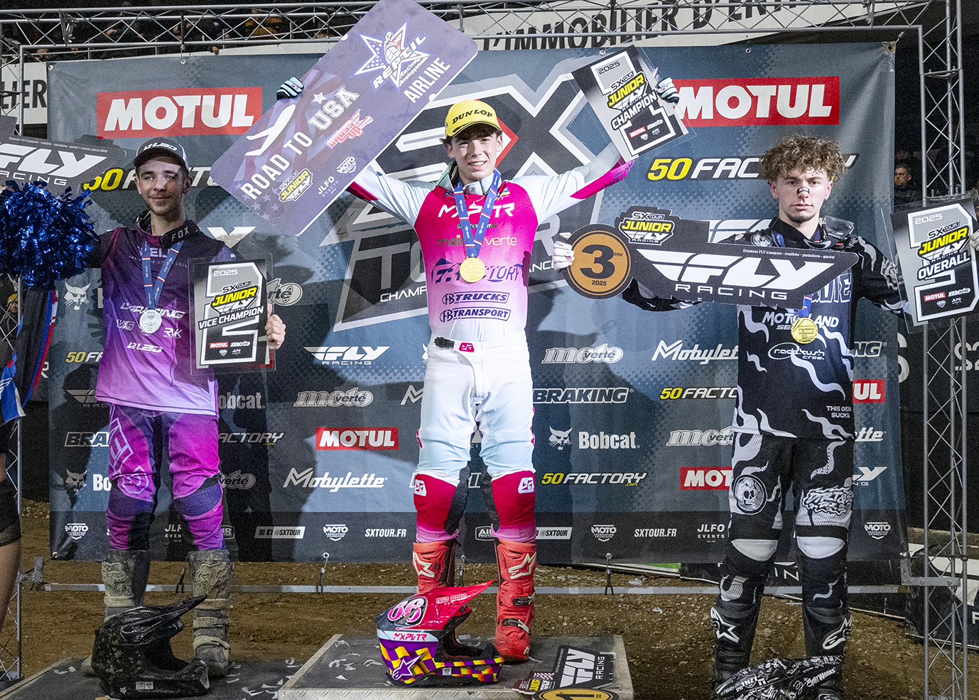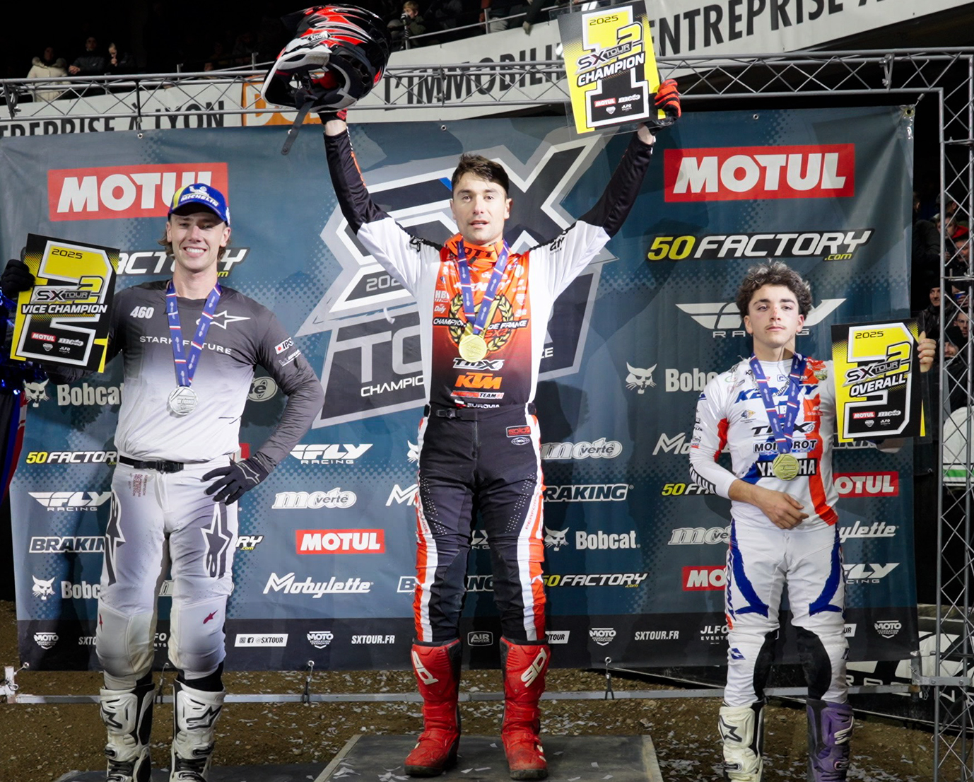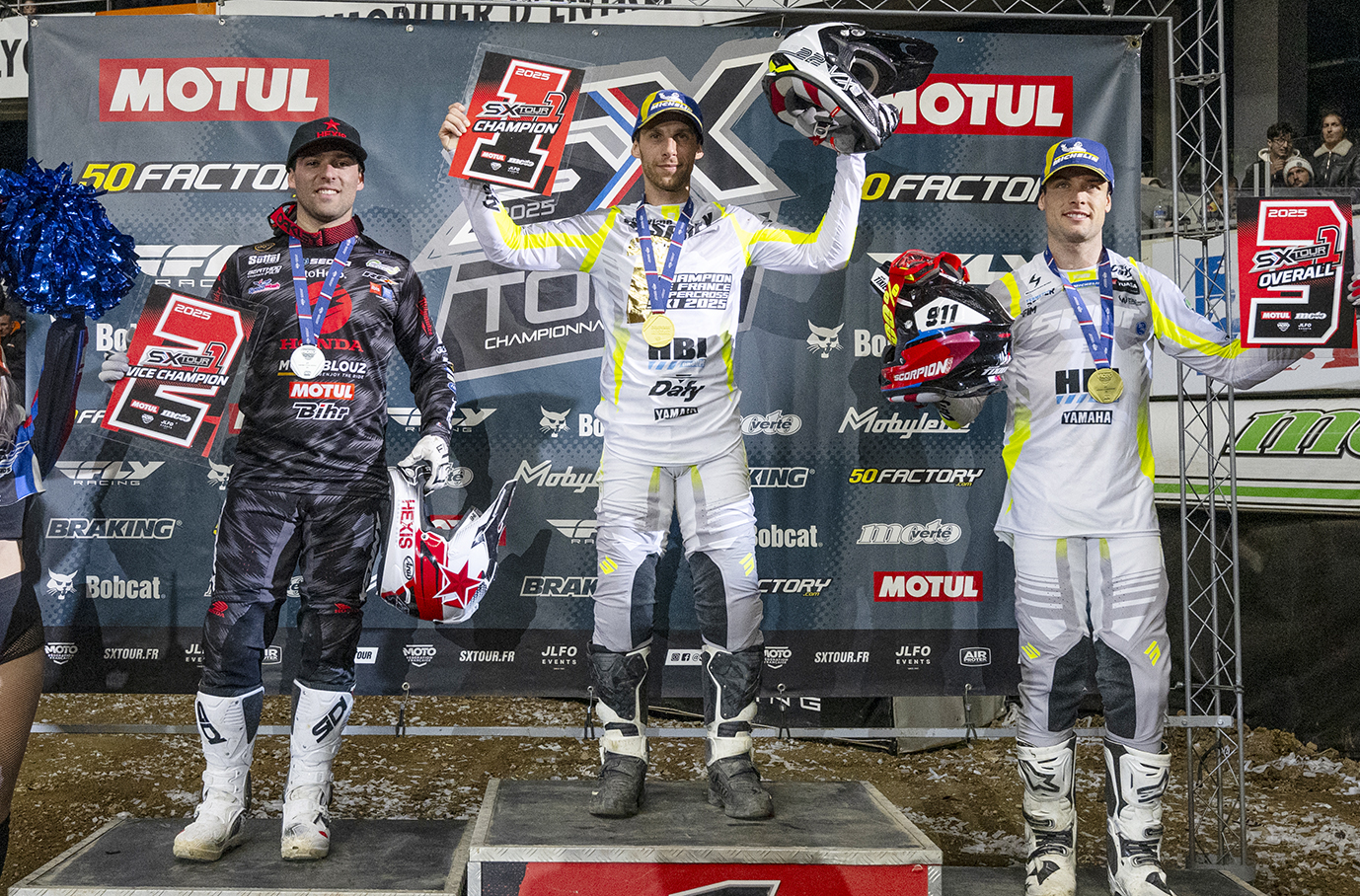 Il touchait enfin la délivrance et décrochait son premier titre SX2 après sept années dans cette catégorie et plusieurs places de vice-champion. Avec cette victoire Michaël Hicks, grimpait sur la seconde marche du podium du championnat mais il aura été menacé dans cette finale par le troisième homme du week-end, Saad Soulimani – TM FTO Reptil. Celui-ci confirmait sa montée en puissance dans la discipline et sa combativité après sa cinquième puis sa seconde place dans l’ultime course. Les flash crépitants et les projecteurs braqués sur le podium final du championnat SX2 ne ramenaient pas le sourire à Jules Pietre – Yamaha TMX pourtant brillant troisième de cette saison mais sérieusement touché en finale au poignet après une chute spectaculaire.