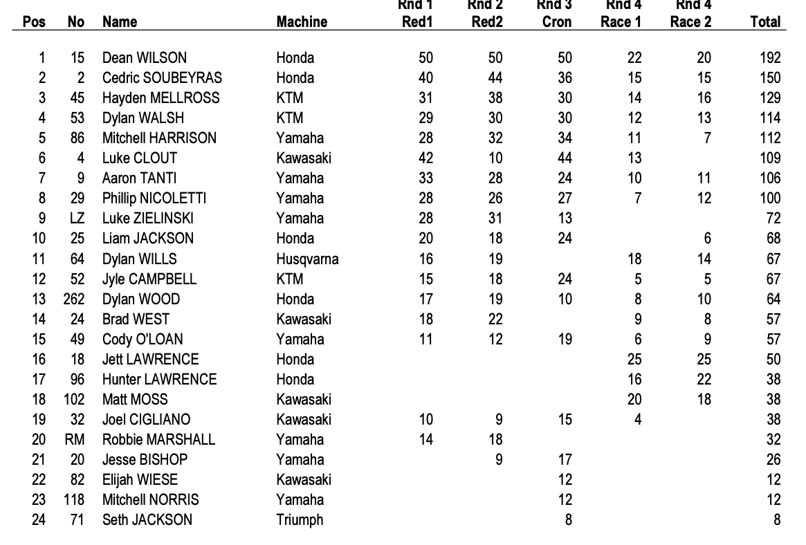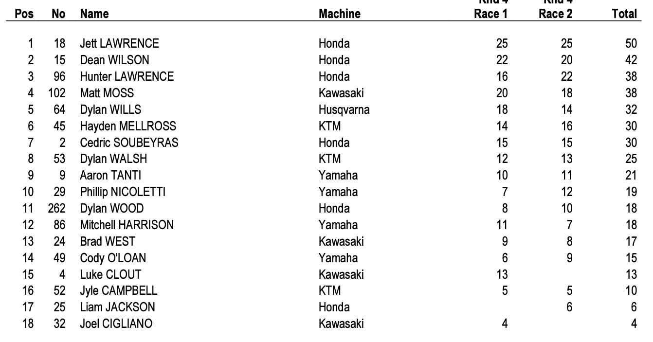 Jett Lawrence ajoute un trophée de plus à sa collection en venant faire une pige à domicile pour l’AUSX Open. Le pilote Honda s’impose dans les deux manches SX1 sans jamais être réellement inquiété, devant un Dean Wilson solide et un Hunter Lawrence combatif qui complète le podium. Cédric Soubeyras termine 7ème et conserve sa 2ème place au classement provisoire avant la finale à Adélaïde.