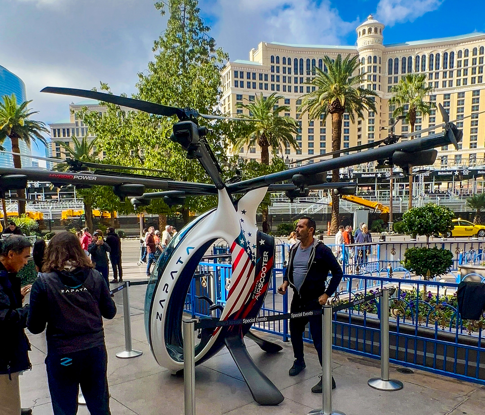 🛞 L’Airscooter de Franky Zapata est exposé devant l’hôtel casino Paris de Las Vegas.