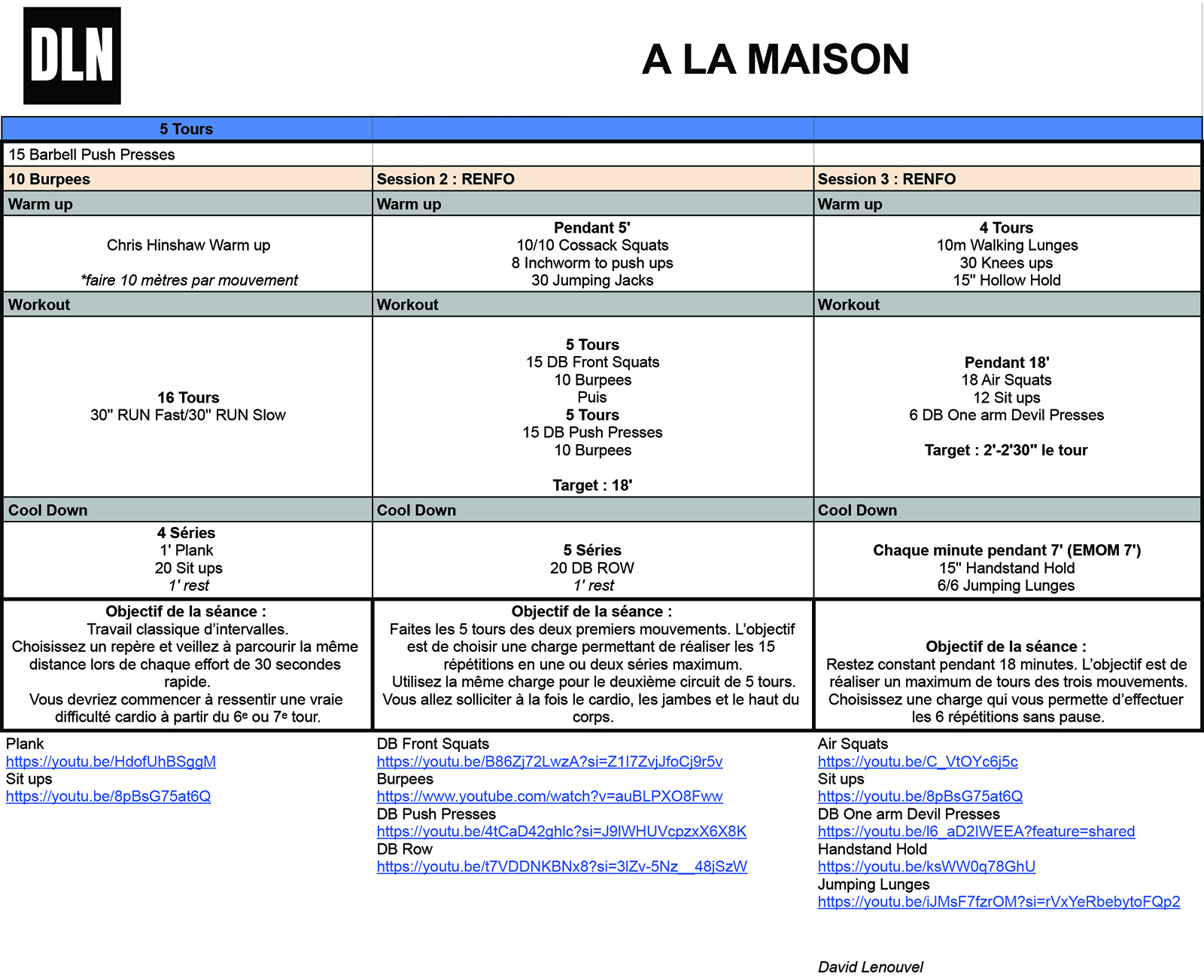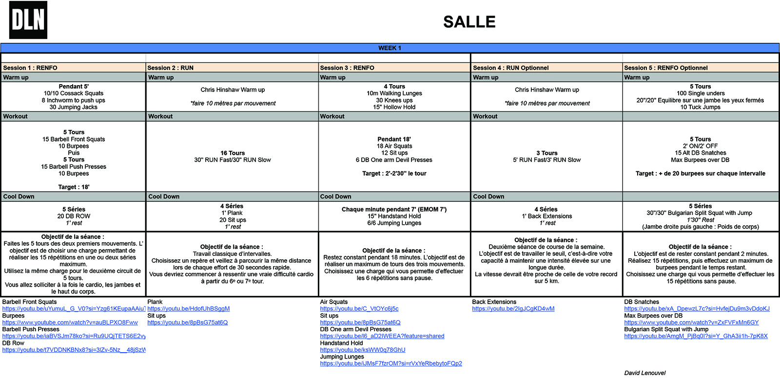 David Lenouvel attaque dans le dur : Après les vidéos de présentation, il entre dans le vif du sujet avec la programmation de votre 1ère semaine d’entrainement. Tout ce qu’il vous faut pour bien démarrer est en vidéo mais aussi dans les tableaux ci-dessous.